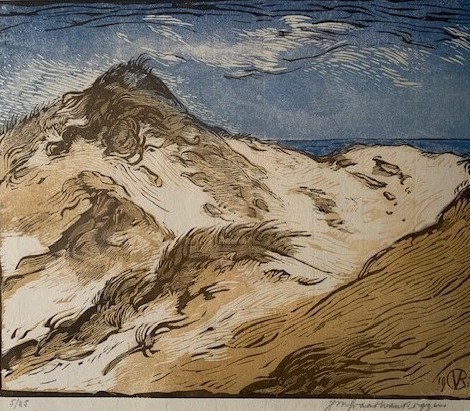 kleurenhoutsnede op papier, gesigneerd en gedateerd in de afdruk met monogram ’19 GvR 18, in potlood gesigneerd rechts onder ‘J M Graadt van Roggen, links onder genummerd 5/25 (d.w.z. nummer 5 uit een oplage van 25) afm. 24,6 x 29,8 cm. in oorspronkelijk houten lijst, in nieuw passe-partout en achter glas.