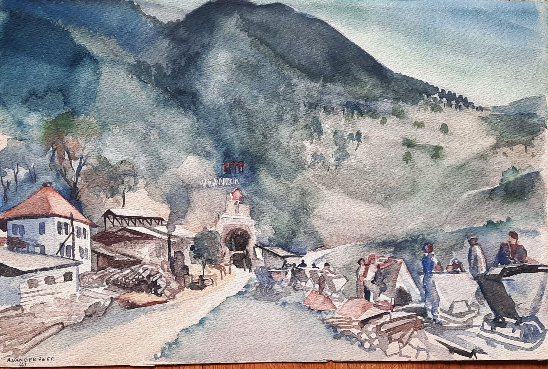 aquarel op papier, afm. 34,5 x 49 cm, gesigneerd en gedateerd rechts onder ‘A van der Feer 1948’